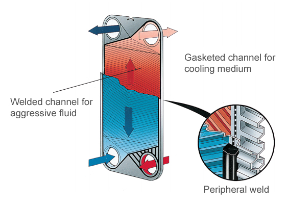 In the Semi-welded heat exchanger the refrigerant flows in laser-welded, sealed plate channels, and in the opposite channel the liquid brine flows in gasketed channels.