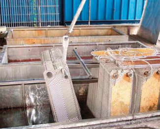 Chemical tanks that are heated and agitated provide a superior plate cleaning process compared to the water blasting and/or hand scrubbing with SS brushes in the field